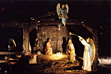 You retreat several steps back from the scene and turn to look down the road once again. This time the Christmas forest seems more dense and dark but you feel compelled to continue. You sense an unusual stillness and all is quiet. You walk slowly and cautiously but yet unafraid towards a curve in the road. You make the turn and step into complete darkness when you are suddenly struck by a blinding light. You come to a halt and cannot believe what you see. There before you is Mary at a very young age. She is kneeling while speaking to the archangel Gabriel who is surrounded by a bright glowing light and you realize you are observing the Annunciation. You hear Gabriel tell Mary she is with child conceived by the holy spirit and she will give birth to a son. His name will be Jesus and he will be the savior of the world. You then observe Mary as being frightened but she listens to Gabriel's gentle words as he describes how she will travel to Bethlehem guided by a star in the sky and give birth to Jesus in that little town. You hear Gabriel further inform Mary that people from far away will come to visit the Christ child and how they will bring presents to honor him including special gifts from three very wise men. Quickly the scene changes and you watch Gabriel as he ascends back to Heaven and you see yourself with Mary. You are very aware how afraid and lonely she is. You further sense her fear of such a responsibility that has been bestowed upon her at such a young age but somehow know Mary will do what has been asked of her by the angel Gabriel. You watch Mary lay down on her bed and weep. You see yourself try to comfort her but it is futile because Mary cannot see or hear you. You watch her gently fall asleep with a heavy heart and you hear yourself say HAIL MARY as the mother of our king. Humbly moved by the scene you had the privilege of witnessing, you